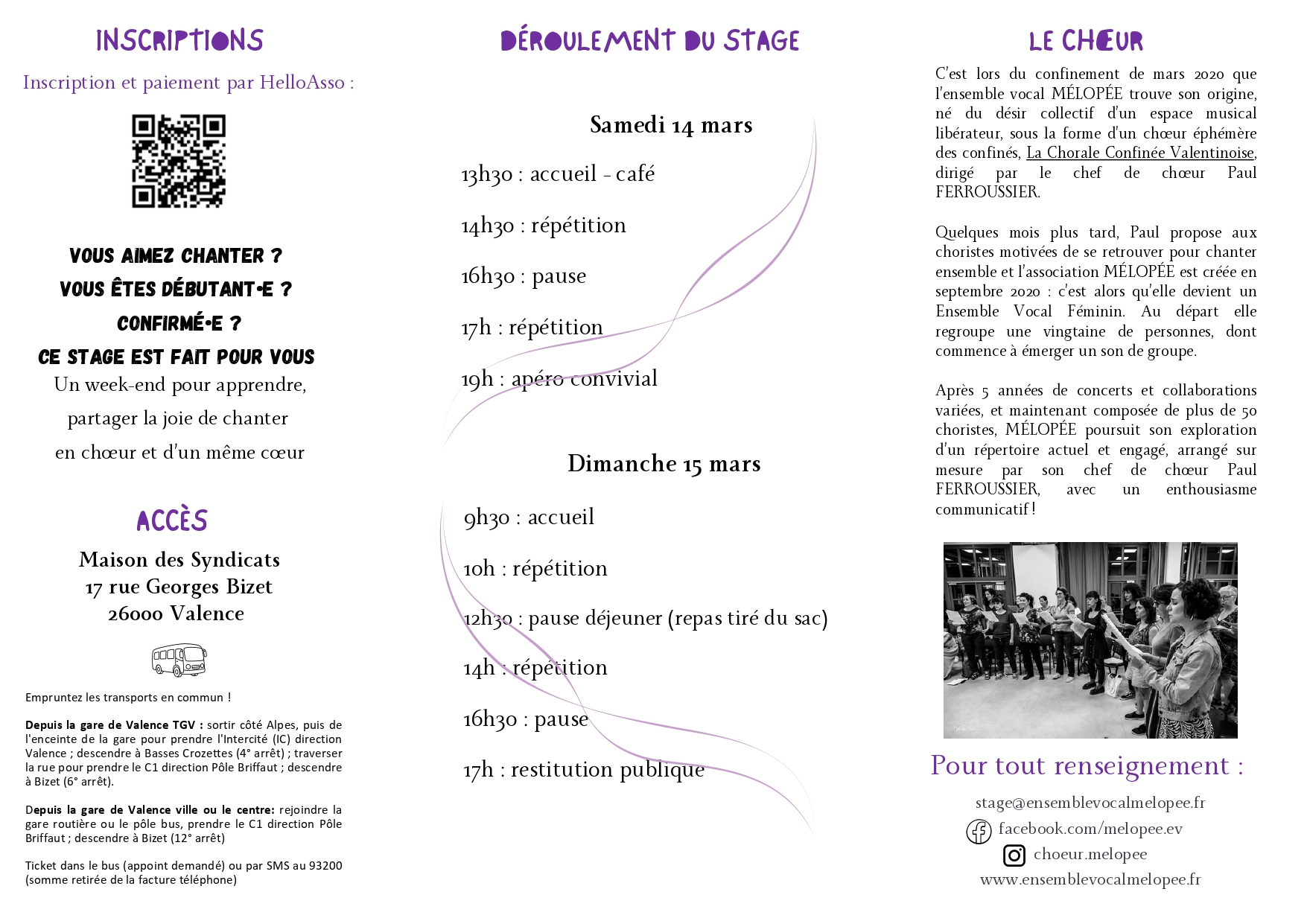 - Le prix (différents tarifs adaptés à chaque situation – individuel, réduit ou famille – à consulter sur HelloAsso) comprend le stage, les partitions et les collations (café et boissons chaudes lors des pauses).