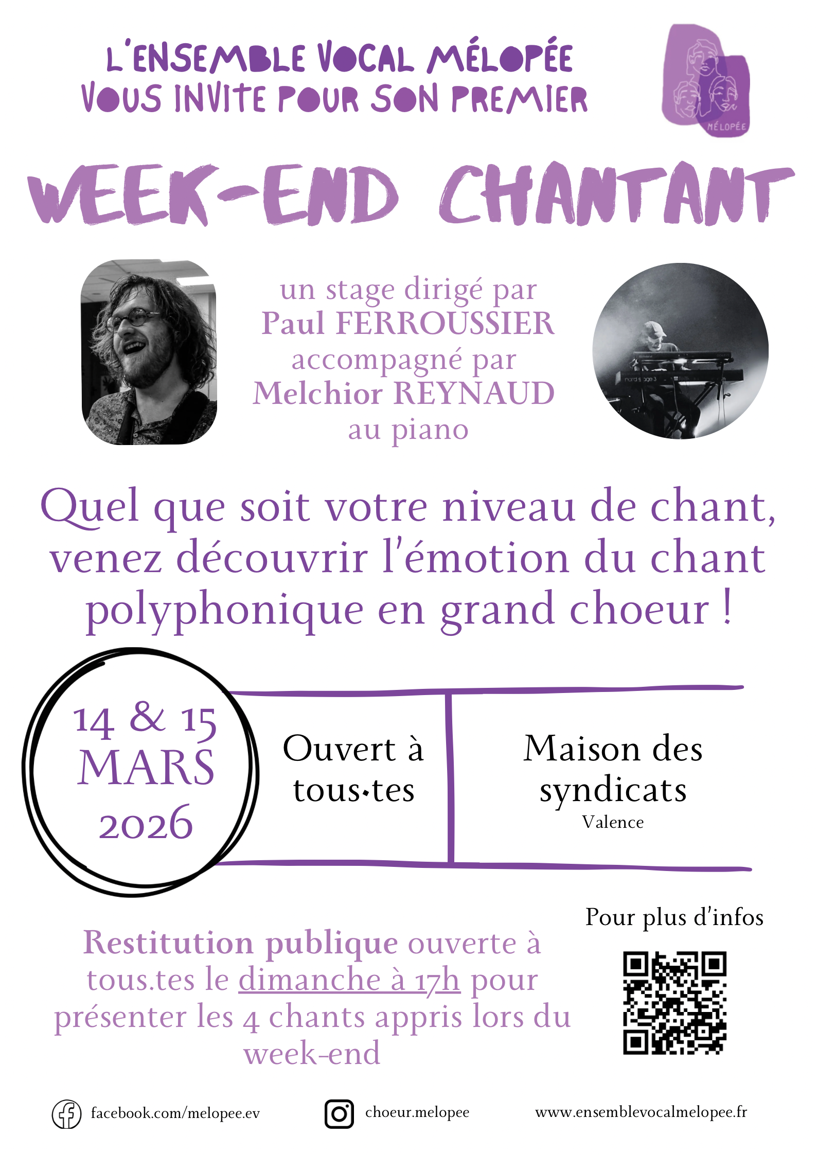 - Au programme : du chant polyphonique en mixité et au grand cœur, avec une restitution publique le dimanche à 17h présentant les quatre chants appris lors du week-end !